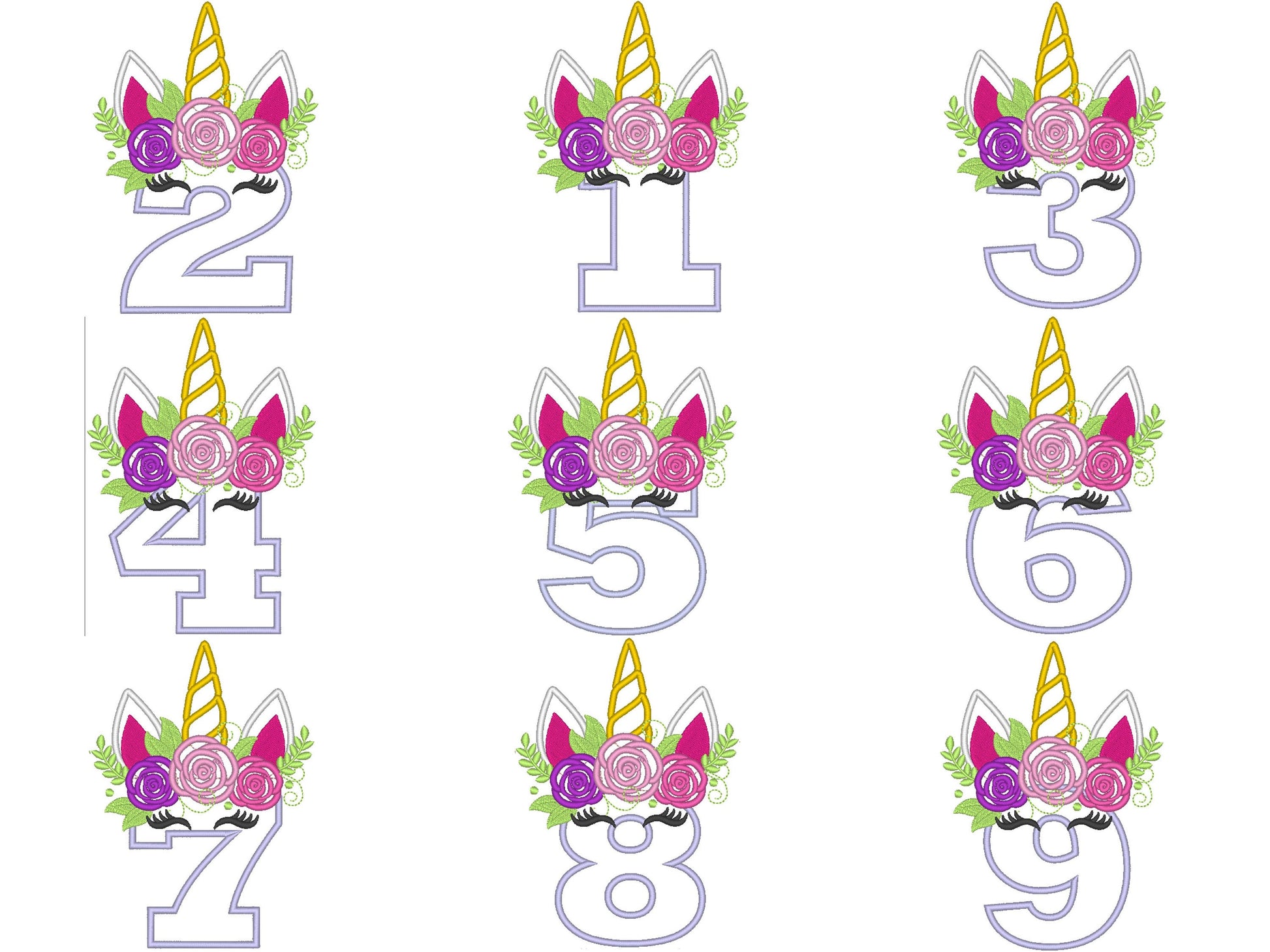 Unicorn numbers with roses crown Unicorn Birthday numbers applique Unicorn number birthday outfit, Unicorn rainbow 5x7 6x10 all numbers