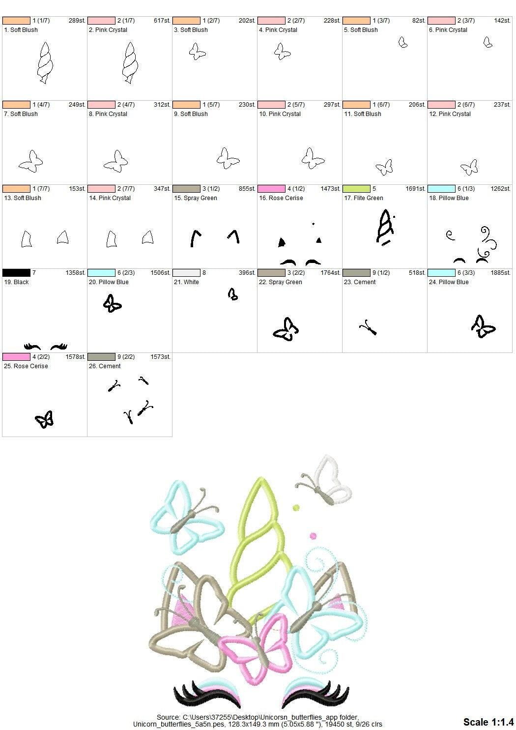 Color charts: PDF or image file with thread colors, stitch order, and counts