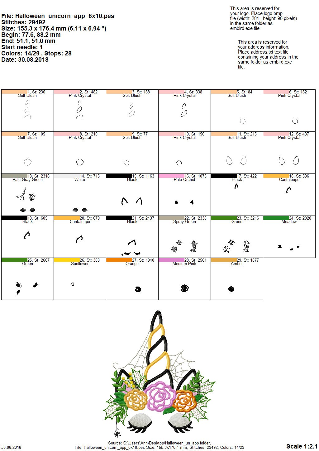Color charts: PDF or image file with thread colors, stitch order, and counts