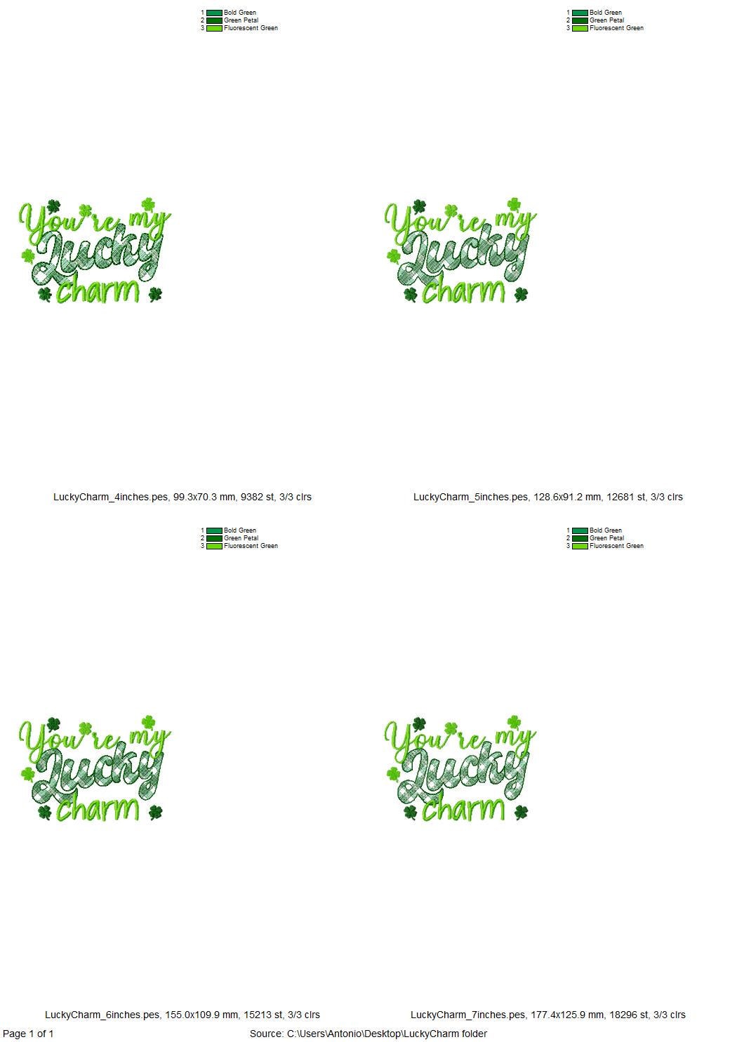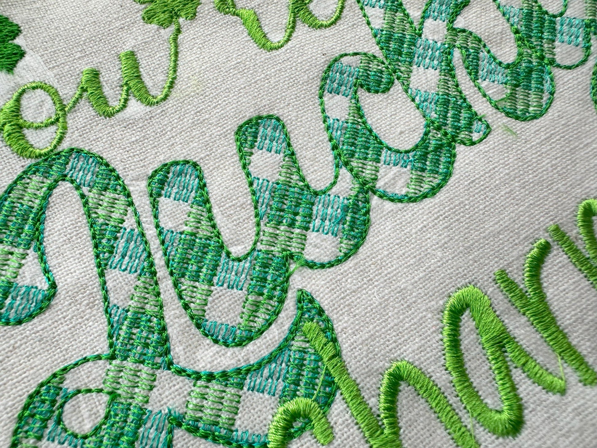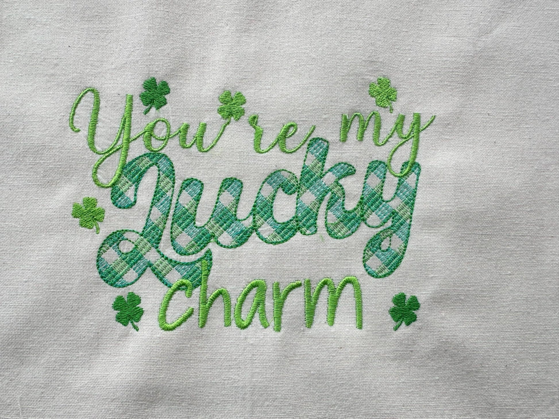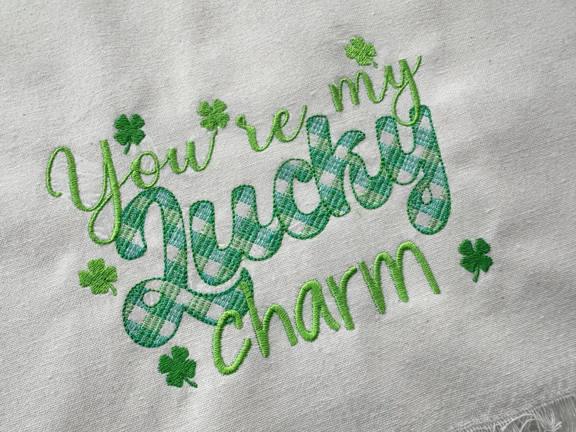 You're my Lucky Charm St Patricks Day saying Shamrock Lucky Clover gingham plaid checkered machine embroidery designs sizes 4, 5, 6, 7" It's NOT an applique. The gingham plaid pattern is a part of the embroidery. The background fabric looks through. Stunning effect!